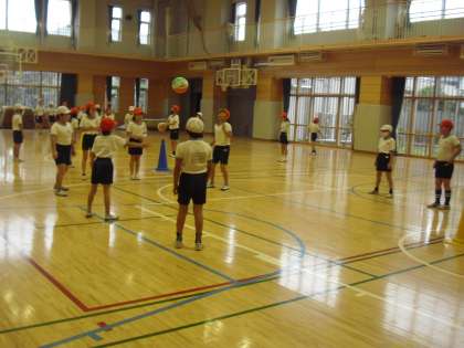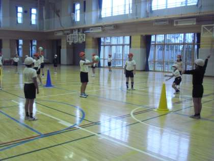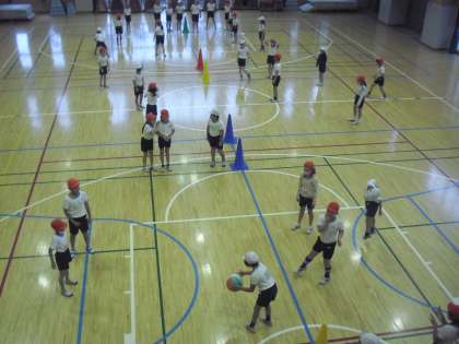 基本的なボール操作やボールを持たないときの動きを学習し、高学年のボール運動の学習につなげていきます。