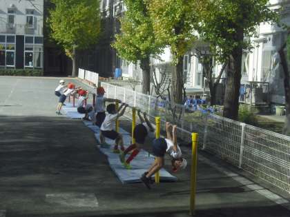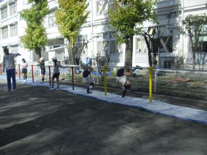 体育で鉄棒を使っての手や腹、膝での支持、ぶら下がり、跳び上がり跳び降り、易しい回転などの運動遊びに挑戦です。
