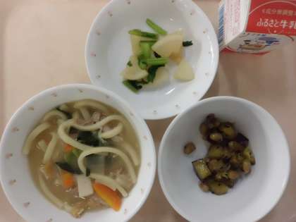 煮込みうどん・牛乳・かぶのレモン漬け・お豆かりんとう