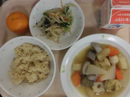 茶飯・牛乳・おでん・しらすと小松菜のあえもの・みかん