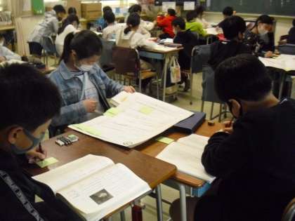 読みとったことから作成した年表に、班ごとにさらに出来事などについて書き加える作業が進んでいました〜