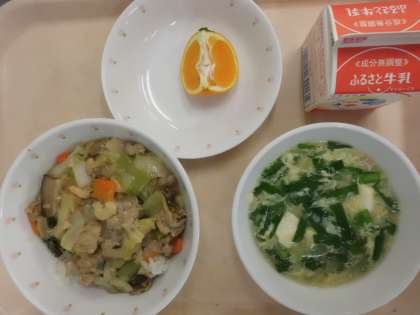 中華丼・牛乳・にらたまスープ・くだもの(はれひめ)
