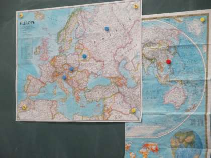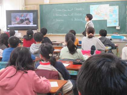 外国の小学校とホリデイカードを交換して交流しています。台湾、スロバキア、ロシア、ベラルーシの学校から届いた動画や写真を見て感想を伝えます。