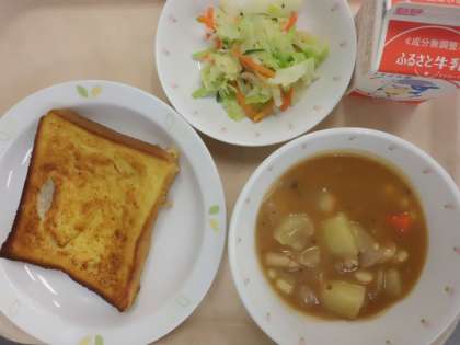 フレンチトースト・牛乳・ビーンズシチュー・グリーンサラダ
