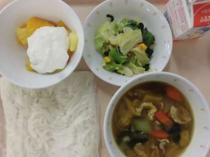 ソフト麺カレーソース・牛乳・野菜サラダ・フルーツヨーグルト