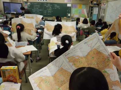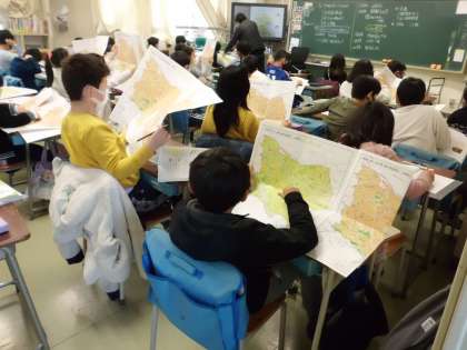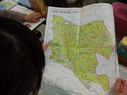 大きな世田谷区の地図を広げ、世田谷区の昔と今を比較していました〜
