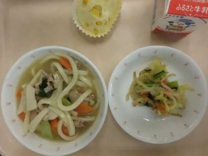 肉うどん・牛乳・野菜のごま和え・コーン入り蒸しパン