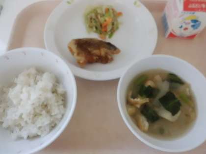 麦ごはん・牛乳・魚のステーキソース・キャベツサラダ・みそ汁