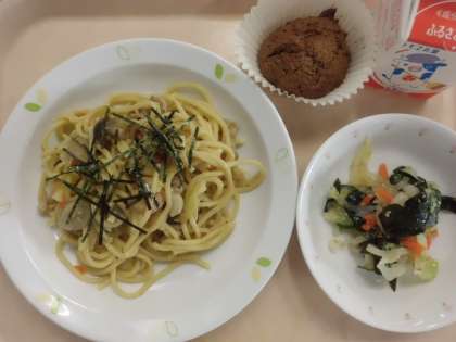 和風スパゲティ・牛乳・わかめサラダ・おからマフィン