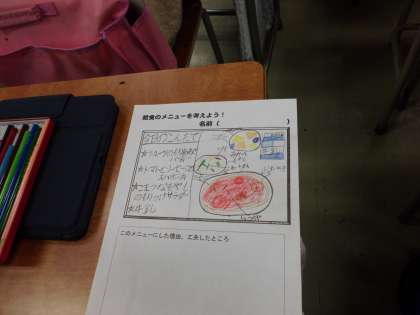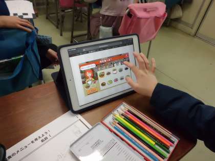 配られたタブレットを使って、食品の栄養について調べ、給食のメニューを考える活動が始まりました〜
