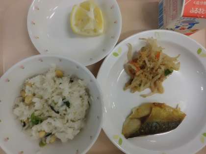 豆菜めし・牛乳・魚のカレー焼き(さば)・ごま酢かけ・