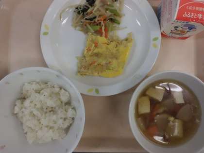 麦ごはん・牛乳・切干大根の卵焼き・きのこ入りお浸し・けんちん汁