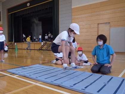 ソフトボール投げ、立ち幅跳び、反復横跳び、長座体前屈、上体起しの記録をとりました。2年生の記録・測定のサポートに5年生の皆さんにも活躍してもらいました。