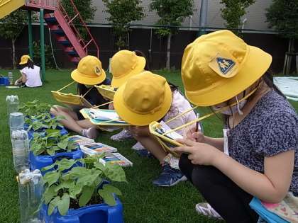 葉の手触りを感じたり、色や形をじっくりと見つめる1年生たち。好奇心の種が芽を出していました。