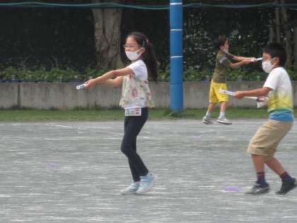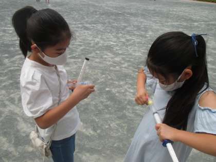 校庭を広く使って、空気鉄砲で遊びました。遊びを通して、どうすれば弾が遠くに飛ぶのかな。勢いよく飛ばすにはどうすればいいかな。弾をたくさん入れるとどうなるのかな。といろいろな疑問が生まれてきました。