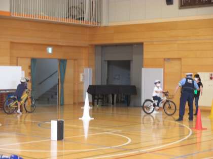 体育館にて、自転車安全教室が行われました。警察署の方から、交通ルールや安全な乗り方などについてお話を伺った後、一人一人が自転車に乗って体験をしました。交差点などの見通しが良くないところには十分に注意して乗ることが大切ですね。