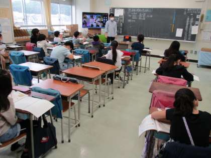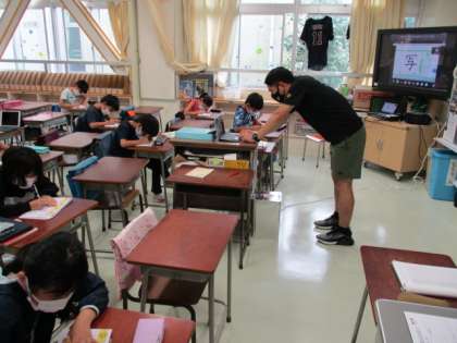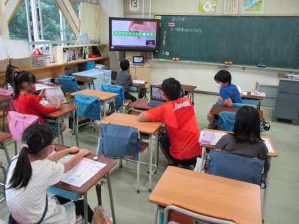 3年生は、ローマ字を新しく学習します。映像を見てみんなで学習しました。別のクラスでは、各自で漢字の練習をしている間に、オンラインの子供たちに様子を聞くなど先生たちも試行錯誤しています。