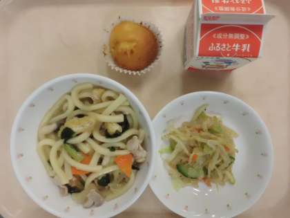 おっきりこみうどん・牛乳・こんにゃくサラダ・りんごケーキ