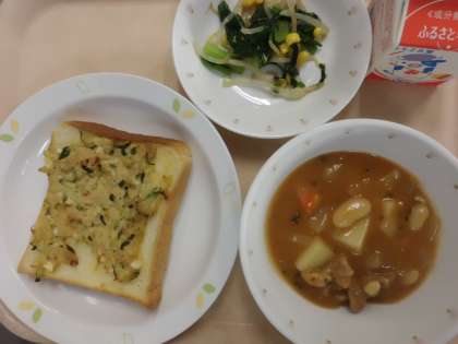 ツナトースト・牛乳・ビーンズシチュー・ほうれん草サラダ