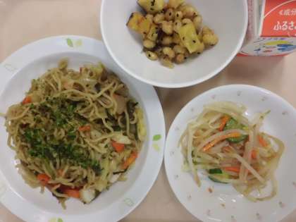 ソース焼きそば・牛乳・もやしの中華和え・お豆かりんとう