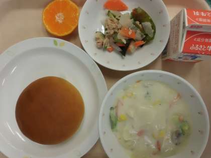 丸パン・牛乳・ブロッコリーのシチュー・わかめサラダ・みかん