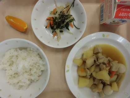 麦ごはん・牛乳・鶏肉とじゃが芋のうま煮・青菜ののりあえ