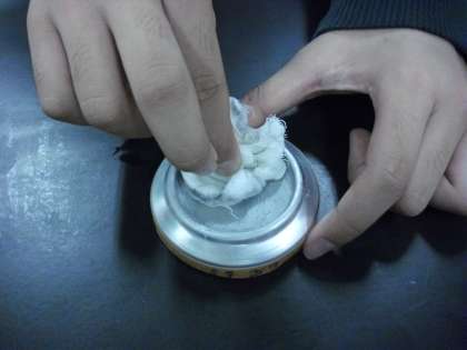 アルミ缶の底を、液状金属磨きで丁寧に磨きます。