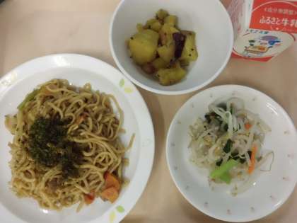 ソース焼きそば・牛乳・ナムル・りんご大学芋