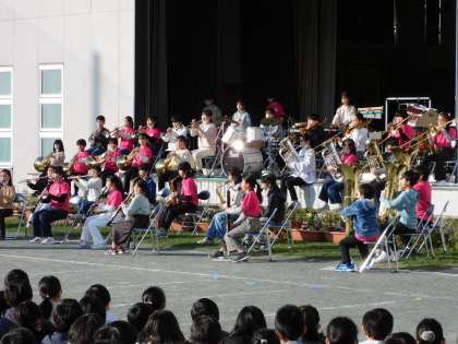 音楽朝会で吹奏楽団の演奏会が開かれました。