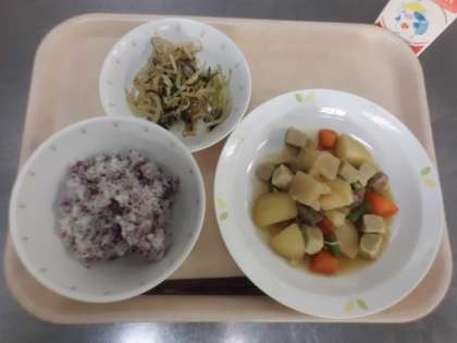 ゆかりごはん・牛乳・鶏肉とじゃが芋のうま煮・小松菜の乾物あえ