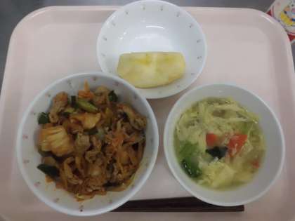 豚キムチ丼・牛乳・卵スープ・くだもの(りんご)