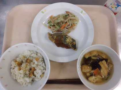 豆ごはん・牛乳・魚のステーキソース・かみかみサラダ・みそ汁