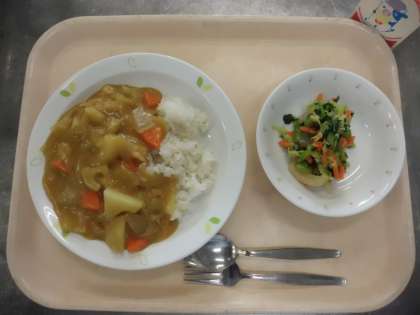 冬野菜のカレーライス・牛乳・小松菜サラダ