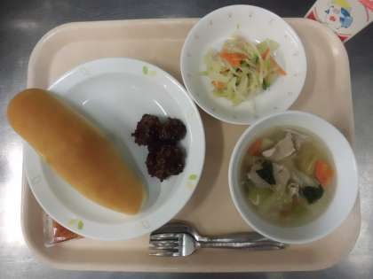 コッペパン・いちごジャム・牛乳・くじらの竜田揚げ・せん切りサラダ