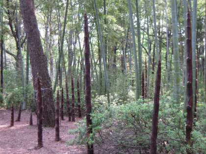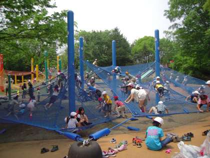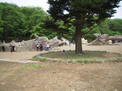 昭和記念公園に遠足に行きました。一枚目の写真 子どもがたくさんいました。二番目の写真 ドラゴン(竜)がたくさんいました。 三枚目の写真は一年生への問題です。○○○○がにょきにょき。