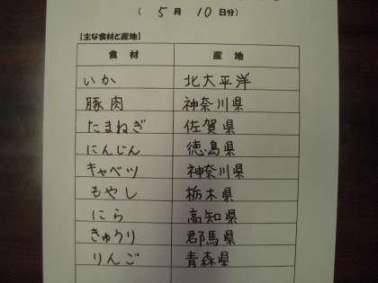 5月10日の給食食材の産地・・・・魚の産地って難しいですね。太平洋って書いておけばいいでしょうか?