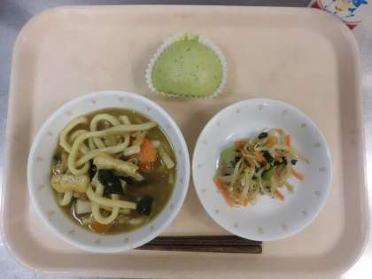 カレーうどん・牛乳・しらすと小松菜のあえもの・お茶の葉むしパン