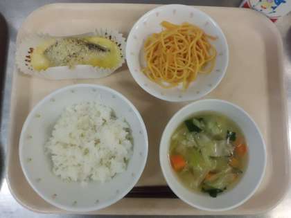 麦ごはん・牛乳・魚のガーリック焼き(あじ)・スパゲティソテー