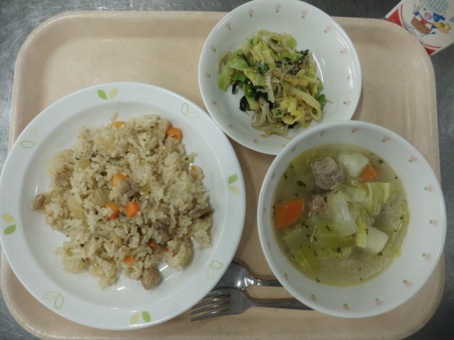 ガーリックピラフ・牛乳・ポトフ・じゃこサラダ