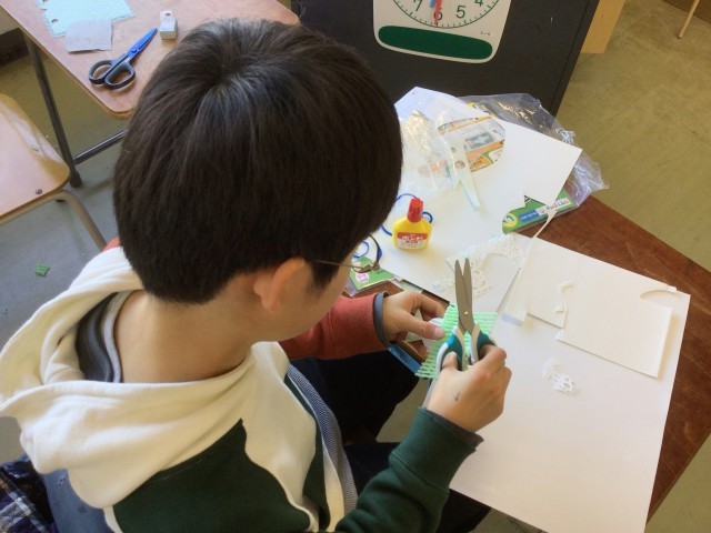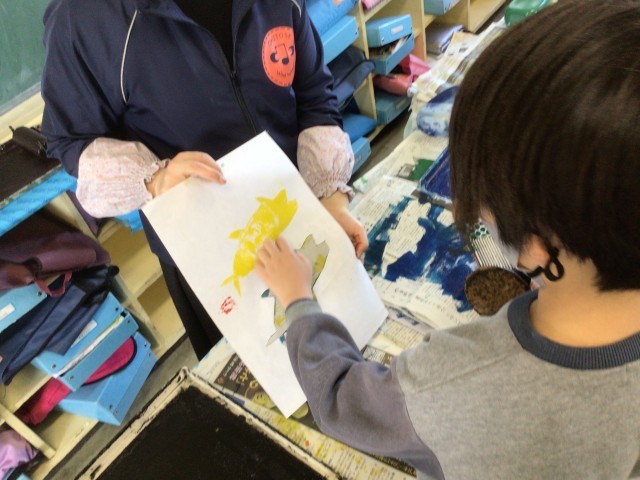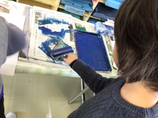 1月図工の学習では、版画に取り組みました。紙や緩衝材などを切って貼って版を作り、色をのせて刷っていきます。自分が作った版からどんな絵が浮かび上がるか、どきどき わくわくしながら刷っていき、素敵な作品ができあがりました。また、何枚か刷った作品を組み合わせたり、友達の作品と並べてみたりと、素敵な世界が広がりました。