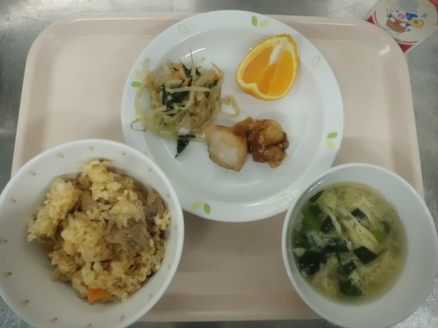 クッパ・牛乳・韓国風鶏のからあげ・ナムル・くだもの(デコポン)