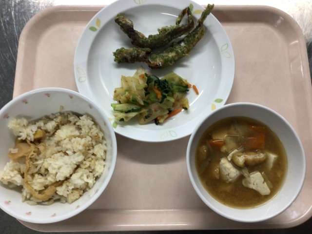 たけのこごはん 牛乳 ししゃものいそべ揚げ 野菜のおかかかけ さつま汁