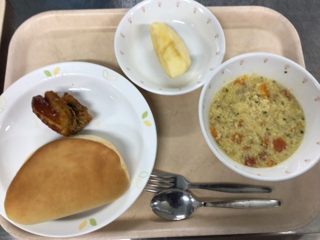 セルフフィッシュサンド 牛乳 卵とトマトのスープ りんご