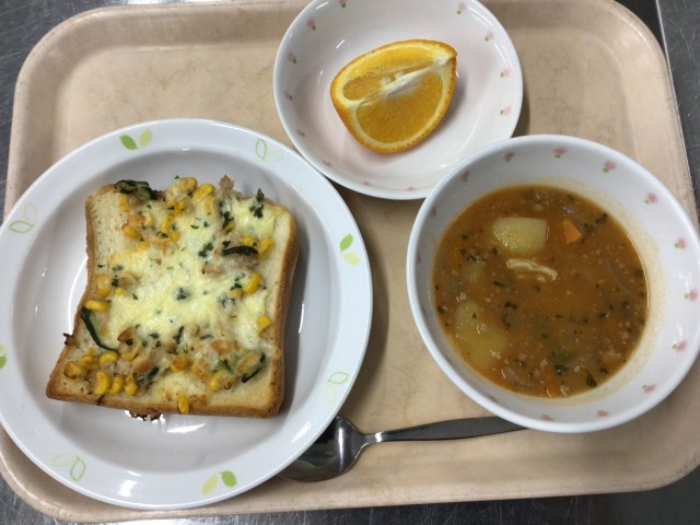 ツナコーンチーズトースト 牛乳 ハンガリアンシチュー 甘夏みかん