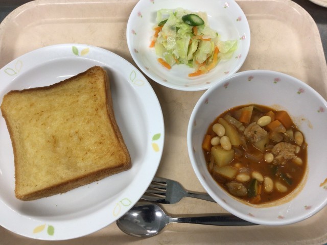 はちみつレモントースト 牛乳 ズッキーニ入りポークビーンズ アスパラガスのサラダ
