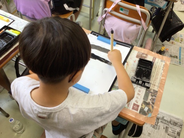 国語・書写の学習では、3年生から毛筆での書写を行います。初めて筆や墨を扱う子たちも多かったため、少し不安も見られましたが、準備を始めてからはみんなやる気満々。「字に自信がない…」という子たちもいたので、まずは心構えから確認をしました。心を込めて丁寧に書くこと。筆の持ち方・立て方を含めて姿勢を意識すること。じっくり書き、書き上げた字をじっくり見ること。書く前に大きく深呼吸をして、いよいよ書いていきます。今回は横画を練習し、漢数字の『二』を書きました。一画一画に思いを込めて、丁寧に書いていきます。「筆を立てて力を込めると、太い字が書けるよ。」「墨が滲むから、墨汁の量も大切だね。」と、書きながらいろいろな発見があったようです。書き終わると、自分の字を見つめて満足そうな表情。素敵な作品に仕上げることができました。