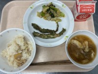 今日のこんだて たけのこごはん 牛乳 ししゃもの磯辺揚げ 野菜のおかかかけ さつ...