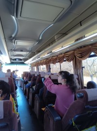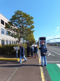 バスに乗り、実際に処分場の中を見学しています。高さ30メートルの見晴台からは、羽...