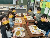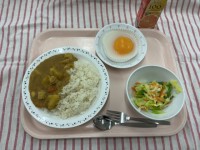 <6年生を送る会縦割り給食>カレーライス 春野菜のサラダおかしな目玉焼き オレン...