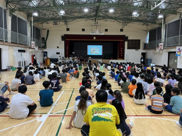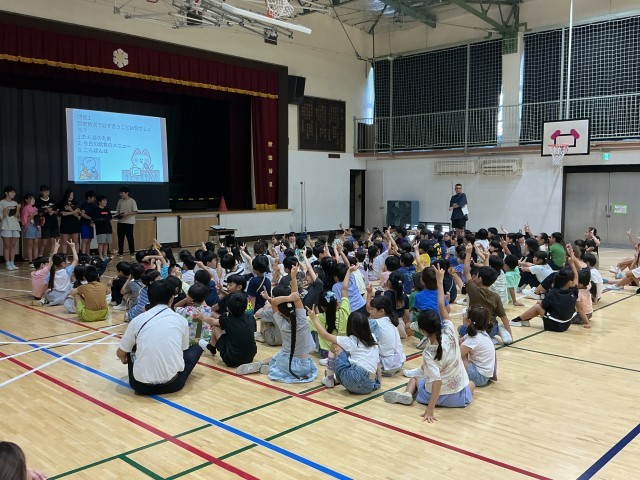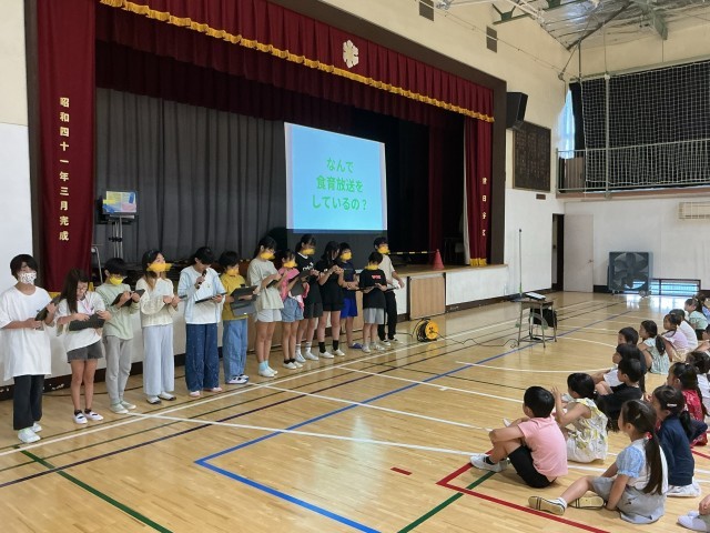 保健給食委員会主催の児童朝会を行いました。いつもより早く準備のために登校した委員会の子どもたち。委員会の仕事や食品ロスについてのクイズを出題し、皆楽しんで参加することができていました。「めちゃくちゃ緊張したけど、みんなが楽しんでくれて嬉しいです」と5年生の委員会児童が気持ちを教えてくれました。